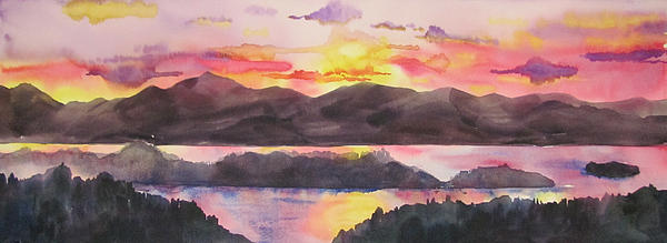 A colorful sunset paints the sky with hues of pink, orange, and purple. The silhouette of mountains creates a dramatic backdrop against the reflective water below.
